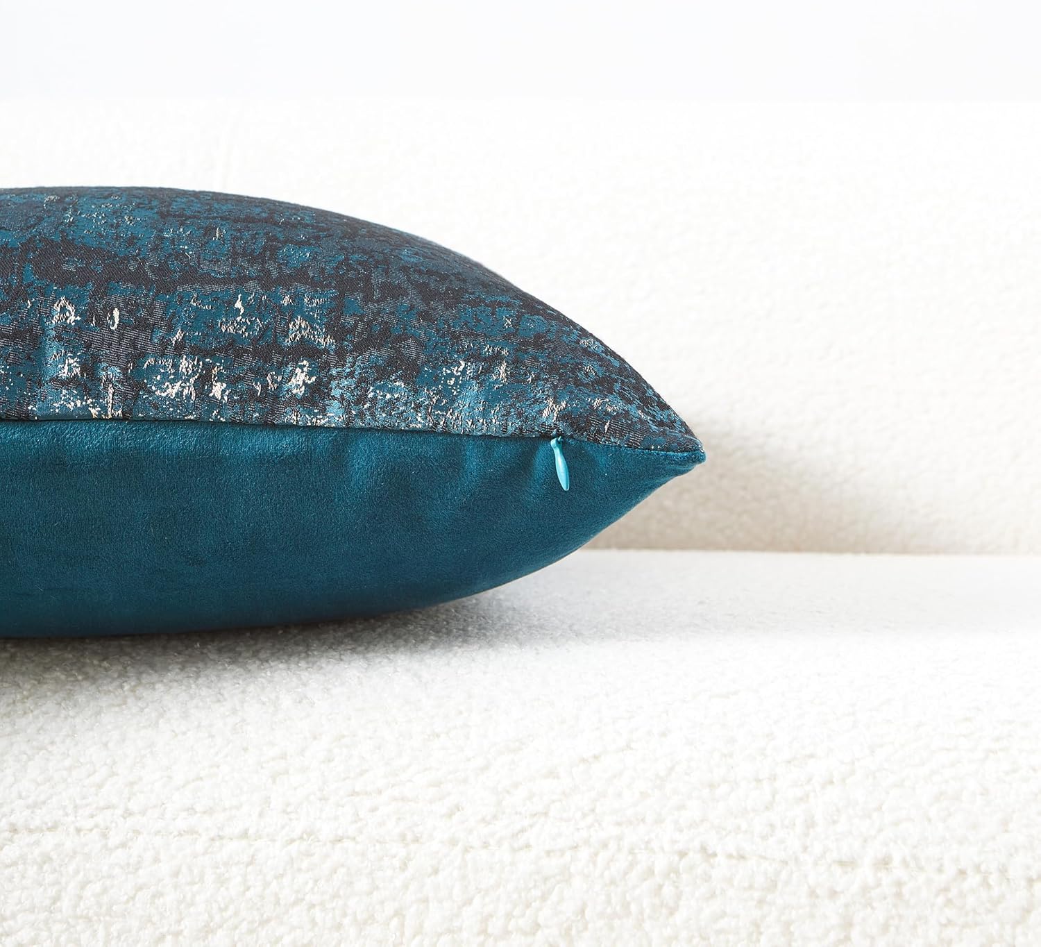 - Premium Jacquard & Velvet Pillow Cover : Crafted with luxe 70% polyester 30% viscose jacquard weave in Teal & Gold - a sophisticated blue-green hue with woven metallic gold threads that create a luminous, jewelry-like glow. The reverse features 100% polyester cream beige velvet in sumptuous cloud-soft texture. Two looks in one-Instantly elevates sofas, beds, or accent chairs from coastal cool to metropolitan glam.